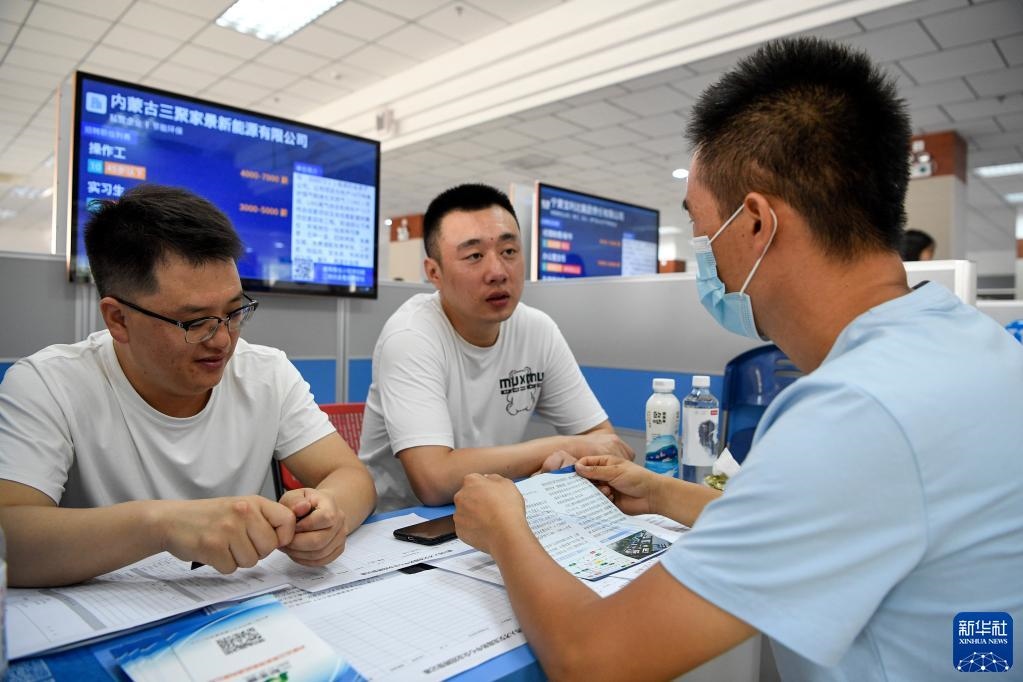 求職者(右一)在2021年寧夏銀川夏季人才招聘大會(huì)暨高校畢業(yè)就業(yè)雙選招聘會(huì)上與用人單位交流(7月24日攝)。新華社記者馮開(kāi)華攝