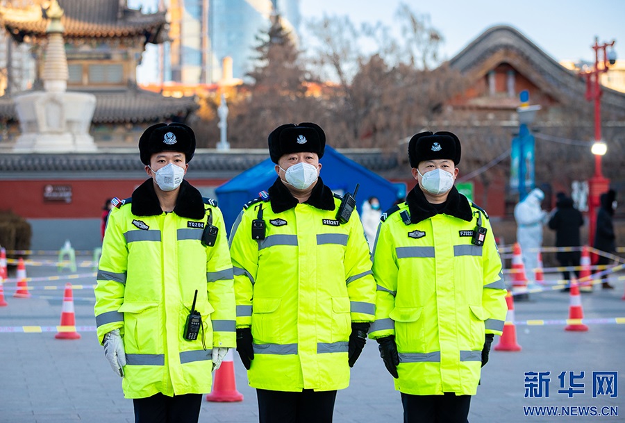 2月21日,在呼和浩特市玉泉區(qū)小召街道五塔寺廣場臨時核酸采樣點,玉泉交管大隊民警在執(zhí)勤。新華網(wǎng)發(fā) (丁根厚 攝)