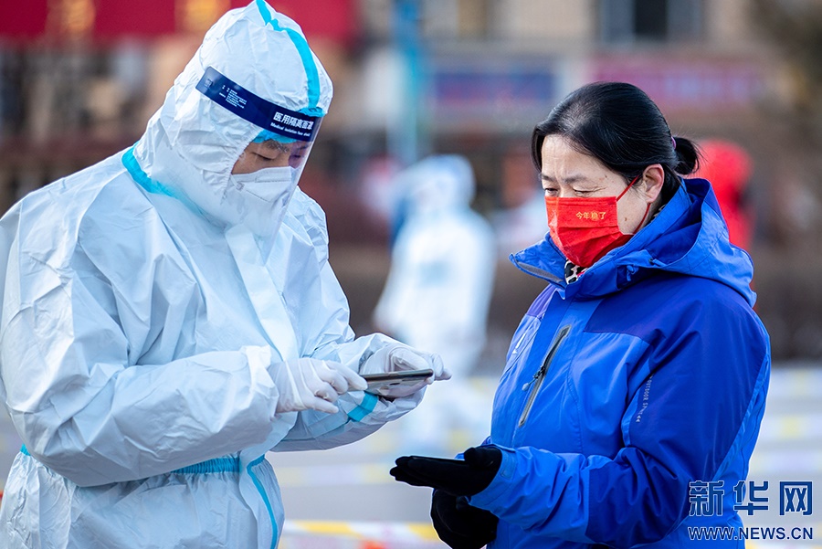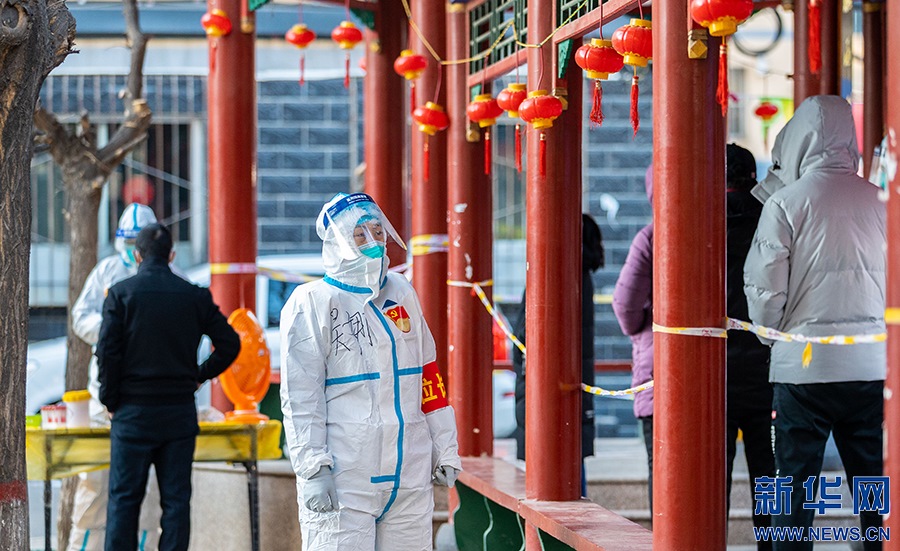 2月21日,在呼和浩特市玉泉區(qū)興隆巷街道芳清園小區(qū)臨時核酸采樣點,點位長在核酸采樣現(xiàn)場工作。新華網(wǎng)發(fā) (丁根厚 攝)