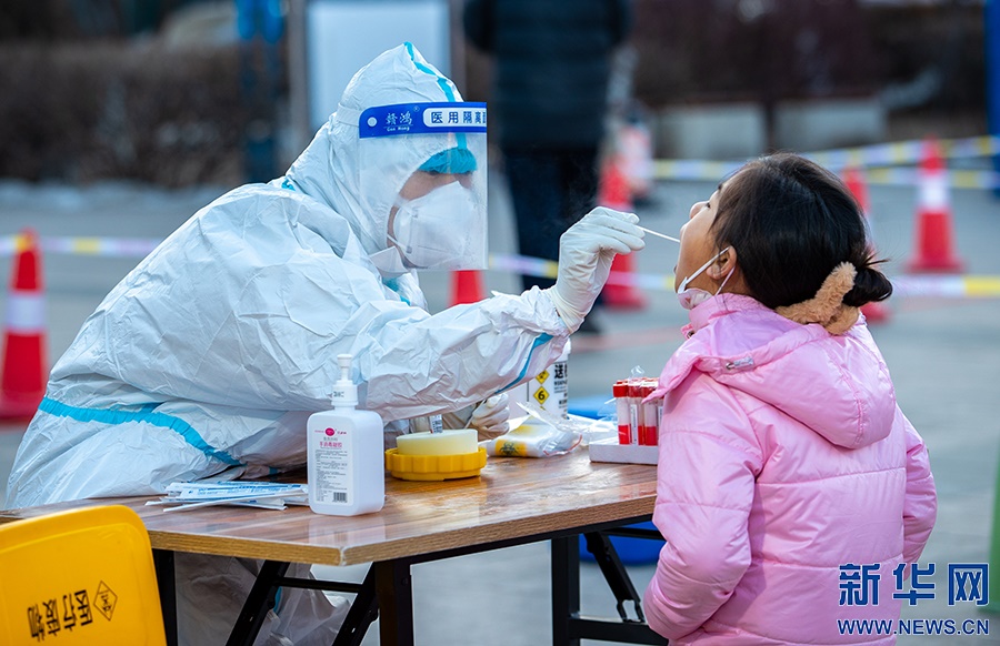 2月21日,在呼和浩特市玉泉區(qū)小召街道五塔寺廣場臨時核酸采樣點,醫(yī)護人員為市民進行核酸采樣。新華網(wǎng)發(fā) (丁根厚 攝)