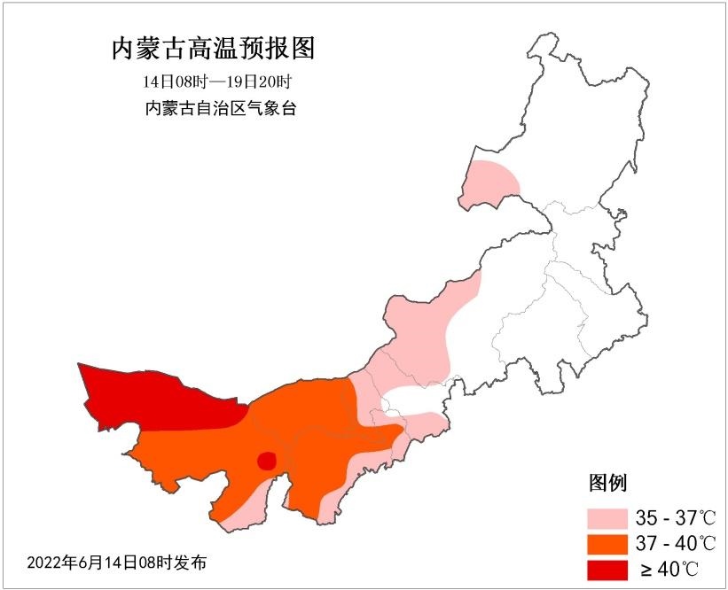據(jù)內(nèi)蒙古氣象臺預計,6月16~20日連續(xù)5天,內(nèi)蒙古西部及中部偏西大部地區(qū)(阿拉善盟、烏海市、巴彥淖爾市、鄂爾多斯市、包頭市、呼和浩特市等大部地區(qū))將迎來今年首次大范圍35℃以上高溫天氣,其中,西部部分地區(qū)最高氣溫將達37℃及以上,局地超過40℃;20~21日阿拉善盟高溫將逐漸減弱消失,而35℃以上高溫天氣向錫林郭勒盟西部延伸。