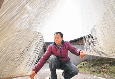 2月16日,江西省撫州市金溪縣滸灣鎮(zhèn)老街區(qū),油面師傅在晾曬老字號(hào)食品滸灣油面。 鄧興東攝(人民視覺(jué))