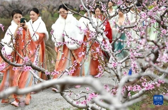 3月24日,在陜西省西安市臨潼區(qū)零口街道零塬村,漢服愛好者穿行于桃園中。