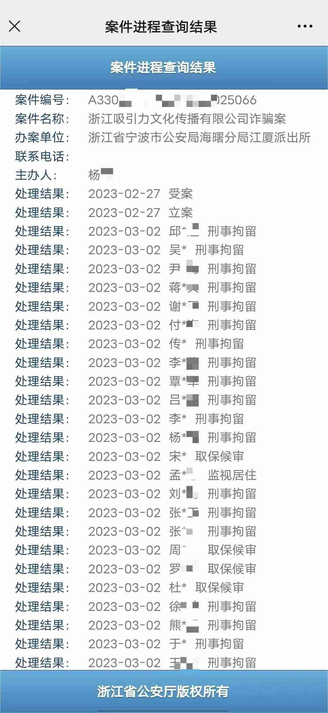 寧波警方一名辦案民警向記者證實(shí)了吸引力公司被調(diào)查一事?!吧婕叭藛T較多,我們現(xiàn)在也在找一些學(xué)員進(jìn)行案件取證工作?!痹撁窬€證實(shí),楊濤鳴真實(shí)姓名為“楊某成”。