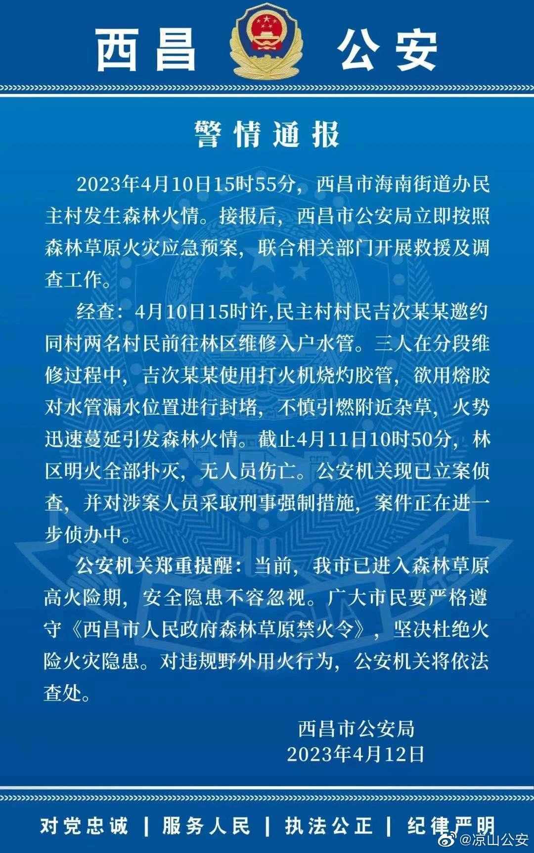 ·西昌警方通報森林火災調查:村民燒灼膠管修水管引燃雜草,涉案人員被控制。