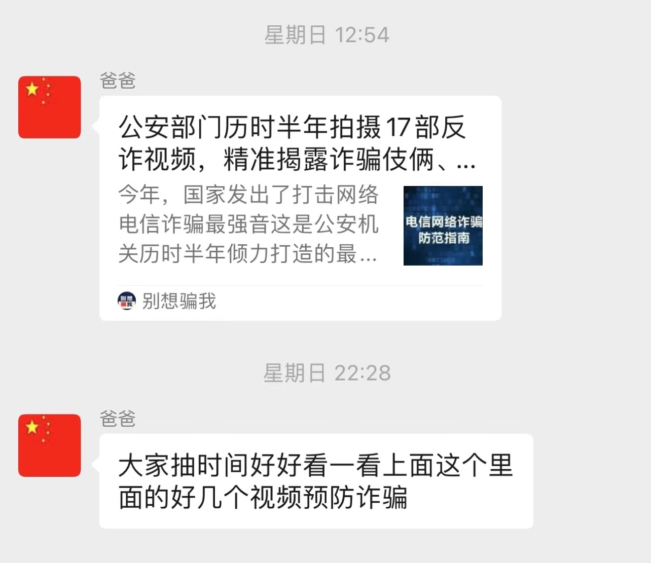 “在群里發(fā)了消息,我肯定會(huì)期待大家的回應(yīng),在我看來家庭群的意義就是如此。如果我真心地進(jìn)行分享卻沒有人回復(fù),心里肯定還是很失落的,更何況我們分享的內(nèi)容是比較有意義的。”上周日張爸爸在群里分享了一則“公安部門歷時(shí)半年拍攝17部反詐視頻,精準(zhǔn)揭露詐騙伎倆”的推文,并表示希望大家抽時(shí)間看一看視頻預(yù)防詐騙,而發(fā)完這條后卻一直沒有人回復(fù),“多次打開群聊卻發(fā)現(xiàn)無人回復(fù),我真的很傷心”,直到4月25日再次出現(xiàn)類似的情況,當(dāng)時(shí)他一氣之下選擇了退群。