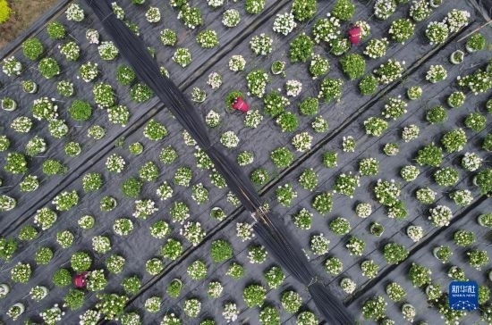 5月5日,在肥西縣經(jīng)開區(qū)一家農(nóng)林科技企業(yè),員工在打理繡球花(無人機照片)。