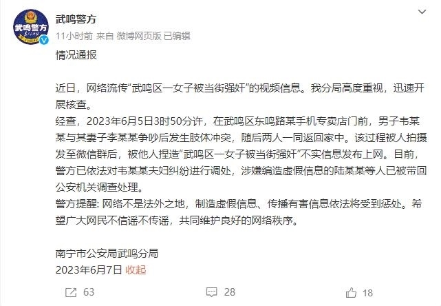 ·警方辟謠南寧一女子被當街強奸:系夫妻吵架發(fā)生肢體沖突,造謠者已帶回調查處理。