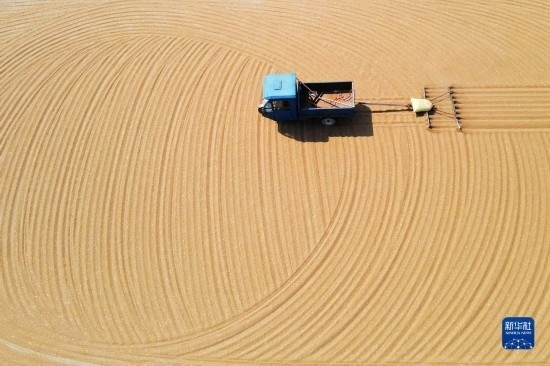 6月9日,江蘇省淮安市淮安區(qū)白馬湖農(nóng)場工人在晾曬小麥(無人機(jī)照片)。