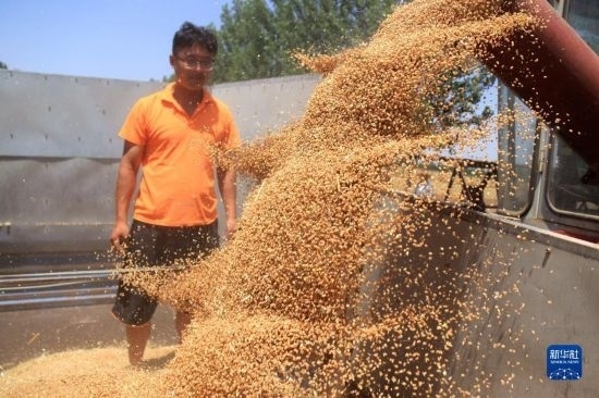 6月9日,農(nóng)民在山東省膠州市洋河鎮(zhèn)黃墩后村田間收獲小麥。