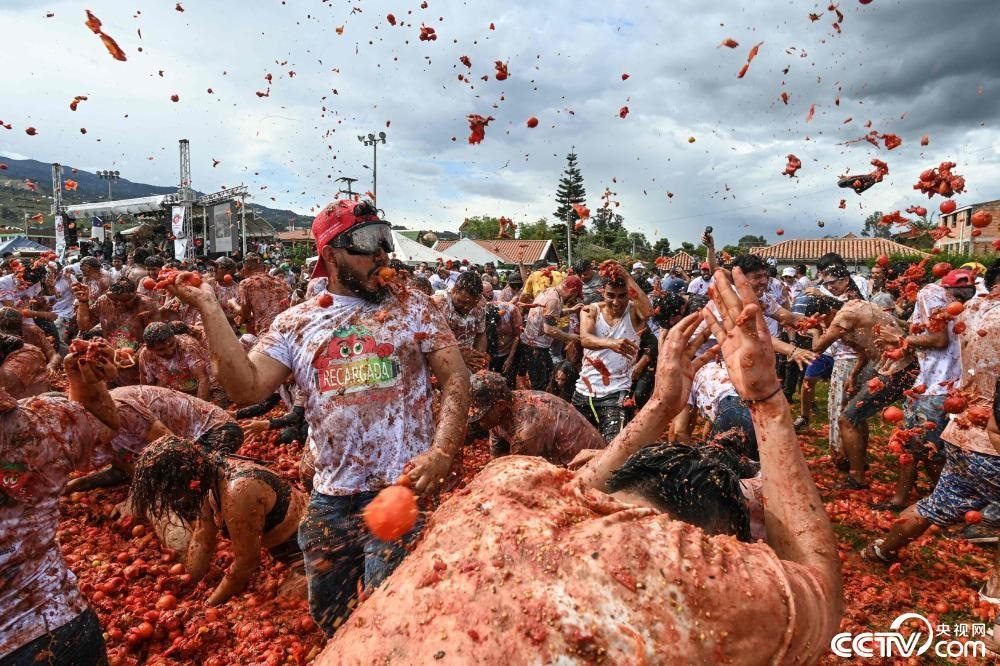 當(dāng)?shù)貢r(shí)間2023年6月11日,哥倫比亞蘇塔馬錢,人們參加一年一度的“西紅柿大戰(zhàn)”。今年的慶典是解除新冠限制以來(lái)的第一次。