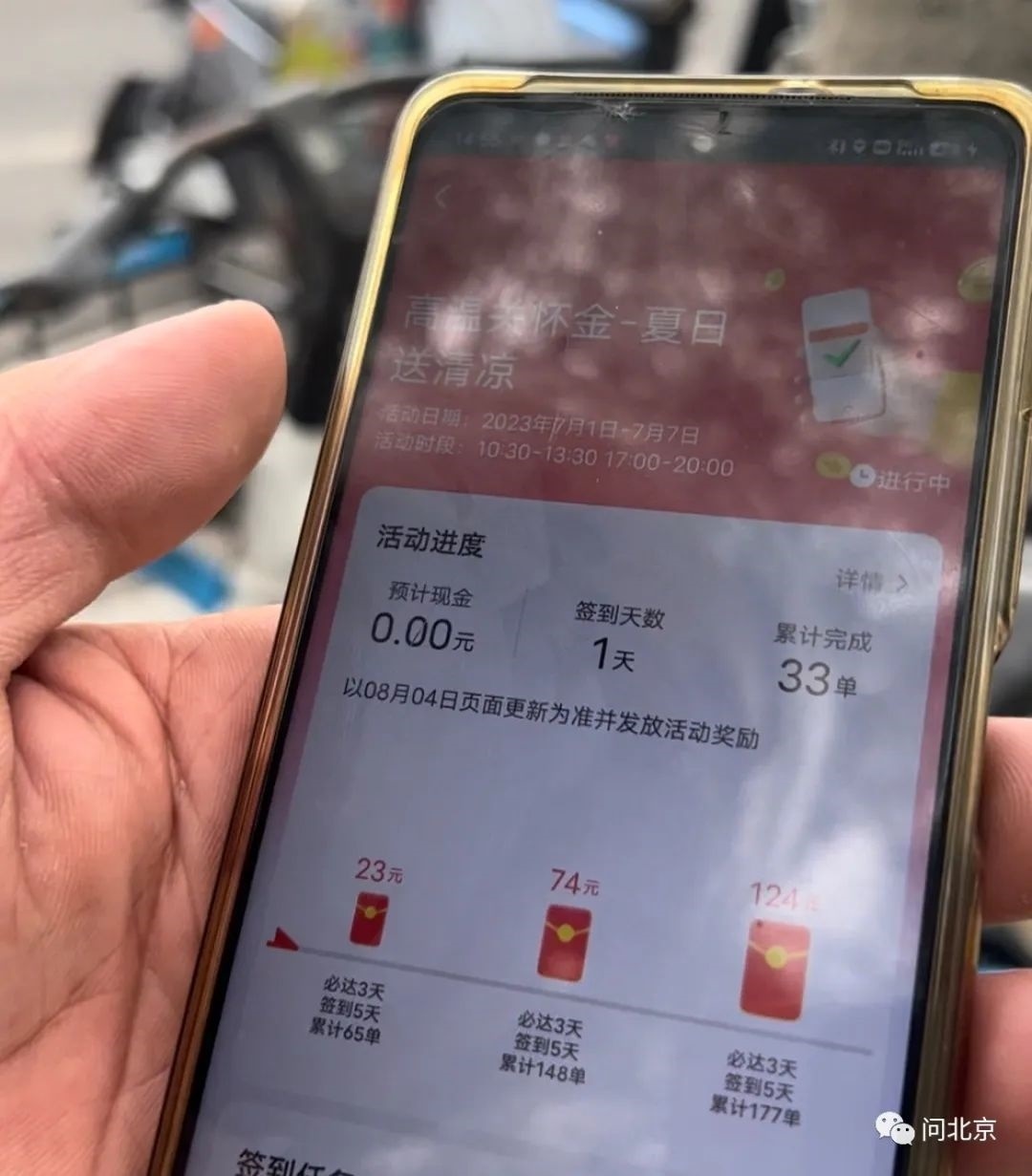 記者點進活動頁面看到,必達3天,簽到5天,累計65單可獎勵23元錢,累計148單可獎勵74元錢,最高獎勵是累積177單可獎勵124元。但是另一名外賣小哥告訴記者,所謂的高溫關懷金,只是另一種方式的沖單獎勵。