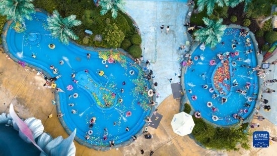 7月8日,游人在湖北省襄陽市華僑城奇夢(mèng)海灘水樂園游玩(無人機(jī)照片)。