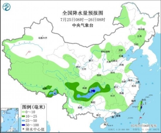 預(yù)計,7月24日08時至25日08時,四川盆地中南部、重慶大部、貴州北部、云南東北部、湖北西南部、湖南西北部以及浙江南部、福建中北部、江西南部、黑龍江北部、西藏東部等地部分地區(qū)有大到暴雨,其中,重慶南部等地局部地區(qū)有大暴雨(100~140毫米)。上述部分地區(qū)伴有短時強降水(最大小時降雨量30~50毫米,局地可超過70毫米),局地有雷暴大風(fēng)等強對流天氣。中央氣象臺7月24日06時繼續(xù)發(fā)布暴雨藍色預(yù)警。