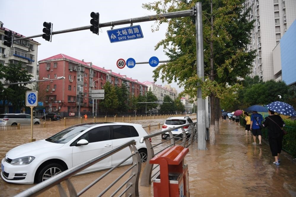 7月31日,在門(mén)頭溝區(qū)大峪南路,行人從積水的路面和泡水的車(chē)輛旁走過(guò)。新華社記者 鞠煥宗 攝