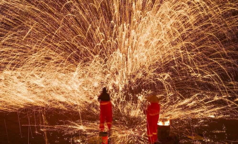 鄂爾多斯文化產業(yè)園景區(qū),民間藝人表演“鐵花秀”。