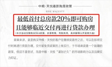 8月26日,紅星資本局向“中糧天悅”售樓部求證此時,一名置業(yè)顧問回復稱,最近確實推出了“先交付后還貸”的購房政策,購房者可以先交首付,簽訂購房合同,交房前再辦理貸款即可。
