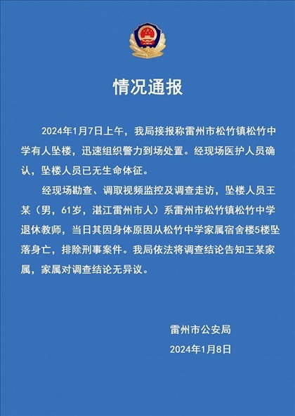 ·廣東湛江一中學(xué)老師墜樓,警方通報:排除刑事案件。