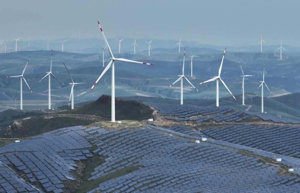 這是2023年9月2日拍攝的承德市豐寧滿族自治縣萬勝永鄉(xiāng)萬勝永村附近的一處風(fēng)光互補(bǔ)發(fā)電場(chǎng)(無人機(jī)照片)。新華社記者楊世堯 攝
