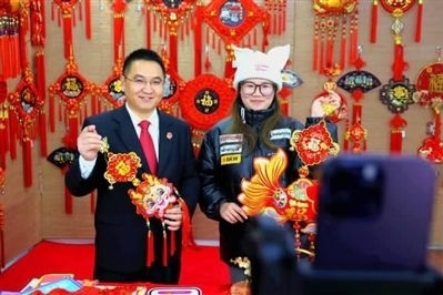 紅花法庭庭長(zhǎng)栗瑞(左)在中國(guó)結(jié)電商直播間客串主播,既“帶貨”又普法。