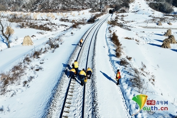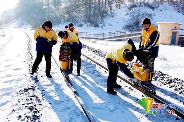 兩臺超聲波鋼軌探傷儀,在身穿橙黃色工作服的探傷工的推行下,緩緩向線路遠(yuǎn)方走去。寒風(fēng)中,探傷工們從頭到腳的防寒裝備也為他們在冬季室外作業(yè)提供了保障。