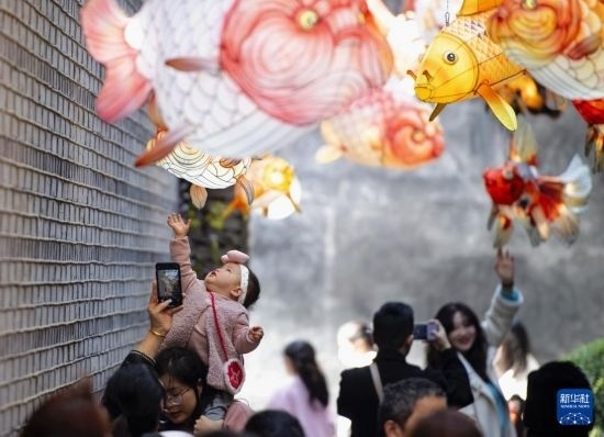 2月10日,市民游客在福州三坊七巷的小胡同里觀賞各式各樣的金魚(yú)花燈。