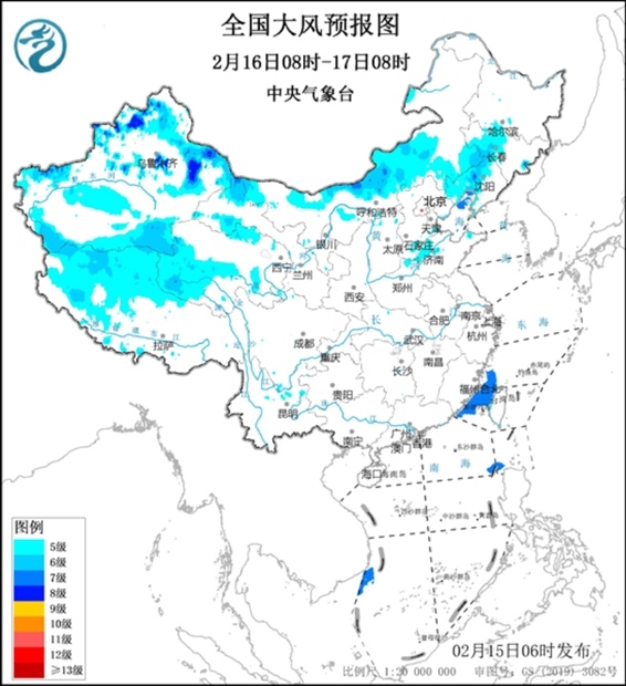 2月15日08時(shí)至16日08時(shí),新疆北部、西藏東部和南部、川西高原中北部等地部分地區(qū)有小到中雪或雨夾雪,其中,新疆阿勒泰地區(qū)有大到暴雪,部分地區(qū)有大暴雪,局地特大暴雪(30~35毫米)。江淮大部、江漢東部、江南、西南地區(qū)東部、華南西部等地部分地區(qū)有小到中雨。西藏中部、內(nèi)蒙古大部、遼寧西部、遼東半島、山東半島、江蘇南部、上海、湖南中北部等地部分地區(qū)有4~6級(jí)風(fēng),其中,浙江中東部部分地區(qū)有6~7級(jí)風(fēng);黃海大部海域、東海大部海域、臺(tái)灣海峽有7~8級(jí)、陣風(fēng)9級(jí)的大風(fēng)(見(jiàn)圖3)。