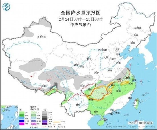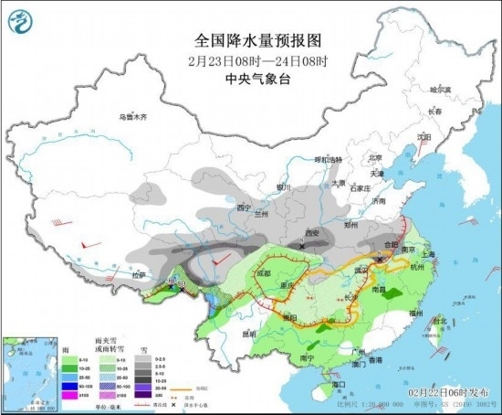 2月23日8時(shí)至24日8時(shí),西藏南部和東部、川西高原、云南西北部、貴州中東部、西北地區(qū)中東部、山西西部、黃淮西部、江淮、江漢、江南北部和西部等地部分地區(qū)有小到中雪或雨夾雪,其中,西藏東部、川西高原北部、陜西南部、安徽中部等地部分地區(qū)有大雪,局地暴雪。西藏東南部、江西中部、福建西北部、云南西北部、廣西東北部等地部分地區(qū)有中到大雨,其中,西藏東南部局地有暴雨(50~90毫米)。西藏中西部、川西高原、遼東半島等地部分地區(qū)有5~6級(jí)風(fēng),其中,西藏西部、川西高原北部等地部分地區(qū)有7~8級(jí)風(fēng);渤海、東海、臺(tái)灣海峽、臺(tái)灣以東洋面、巴士海峽、南海東北部海域有6~7級(jí)風(fēng)、陣風(fēng)8~9級(jí)。