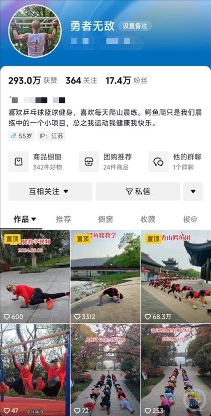 上游新聞?dòng)浾呖吹剑{魚健身團(tuán)最火的一個(gè)視頻獲得了上百萬的點(diǎn)贊量和上千萬瀏覽量,浙江、湖南等地也出現(xiàn)了類似健身團(tuán)體。