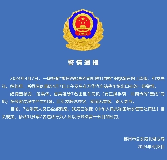 經(jīng)調(diào)查核實(shí),段某華、唐某雄等7名出租車(chē)司機(jī)(有正規(guī)手續(xù),非網(wǎng)傳的“黑的”司機(jī))在候客過(guò)程中產(chǎn)生糾紛,后引發(fā)肢體沖突,期間無(wú)乘客、路人參與。