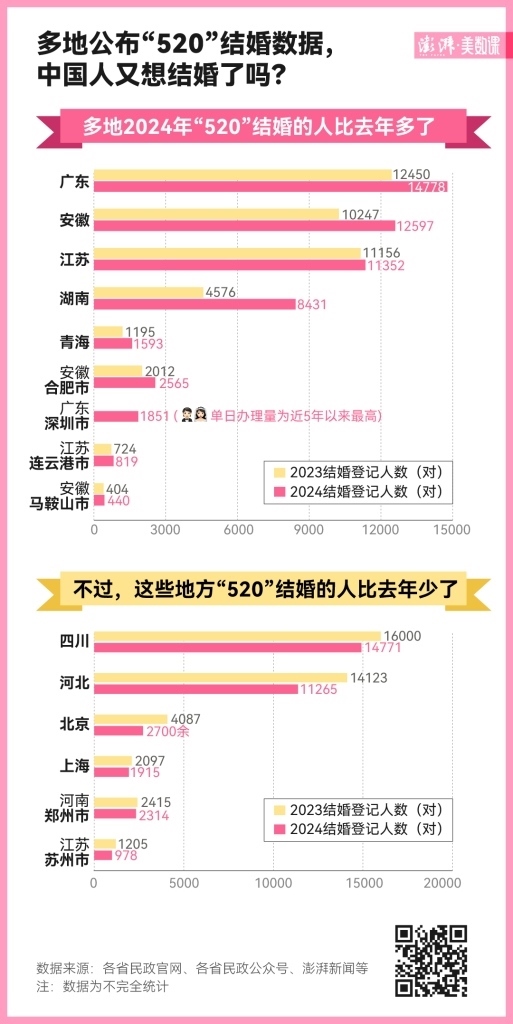 2023 年多地“520”領(lǐng)證人數(shù)下跌,引起熱議。2024 年的“520”剛剛過去,多地披露了當(dāng)日結(jié)婚登記數(shù)。廣東、安徽、江蘇等省當(dāng)日領(lǐng)證人數(shù)較去年有回升。澎湃新聞從深圳市民政局獲悉,截至 5 月 20 日 18 時(shí) 30 分,“520”全天共辦理結(jié)婚登記 1851 對(duì),單日辦理量為近 5 年以來最高。中國(guó)人又重燃對(duì)婚姻的渴望了嗎?
