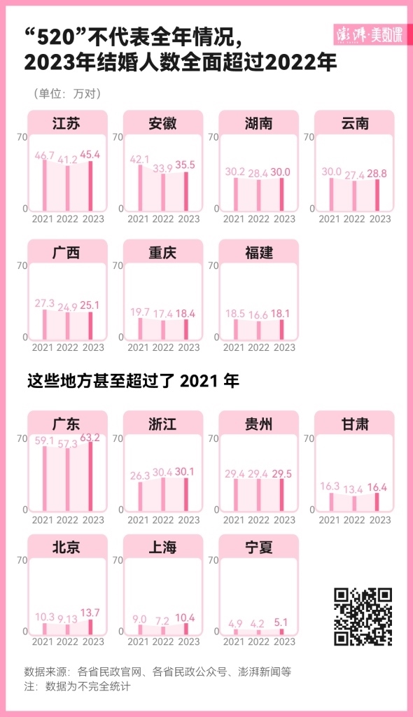 2023 年多地的“520”領(lǐng)證人數(shù)下跌,媒體報(bào)道稱“年輕人不太愿為愛結(jié)婚了”,但實(shí)際上,全年情況卻沒這么慘淡。