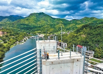7月24日,中國(guó)鐵路上海局集團(tuán)有限公司寧波工務(wù)段防洪檢查小組的鐵路工人對(duì)杭溫高鐵楠溪江大橋主塔進(jìn)行巡檢。新華社記者 江 漢攝
