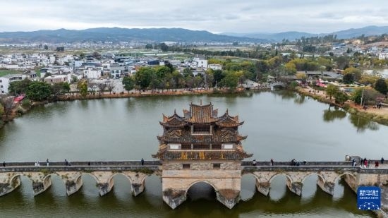 2月3日,游客在云南省建水縣雙龍橋游覽(無(wú)人機(jī)照片)。