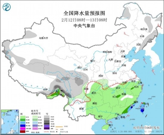 全國降水量預(yù)報圖(2月12日08時-13日08時) 圖片來源:中央氣象臺網(wǎng)站