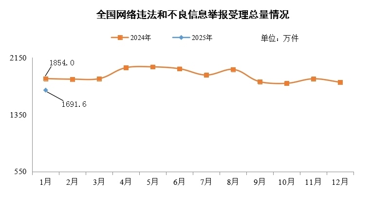 中央網(wǎng)信辦舉報(bào)中心2月17日公布的數(shù)據(jù)顯示,2025年1月,中央網(wǎng)信辦舉報(bào)中心指導(dǎo)全國各級網(wǎng)信舉報(bào)工作部門、主要網(wǎng)站平臺受理網(wǎng)民舉報(bào)色情、賭博、侵權(quán)、謠言等違法和不良信息1691.6萬件,環(huán)比下降6.2%、同比下降8.8%。