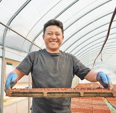 種好超級雜交水稻,秧苗質(zhì)量很重要。農(nóng)技人員要提前浸種、曬種,防治多種傳染病害。在基地,農(nóng)戶也早早準備了育秧材料。倒入基質(zhì)土、送入秧盤、鋪土、澆水、撒種、蓋土……一系列工序后,育秧盤送入暗室催芽,再過兩天,擺進溫室大棚。