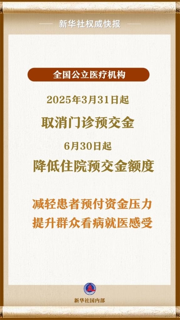 國家衛(wèi)生健康委、財政部、國家醫(yī)保局等6部門日前聯(lián)合印發(fā)《關(guān)于規(guī)范公立醫(yī)療機構(gòu)預交金管理工作的通知》,要求公立醫(yī)療機構(gòu)自2025年3月31日起全面停止收取門診預交金,自2025年6月30日起降低住院預交金額度。