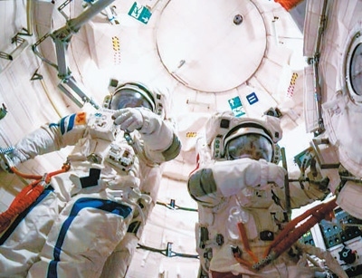 神舟十九號航天員蔡旭哲(右)、宋令東在做出艙準備。