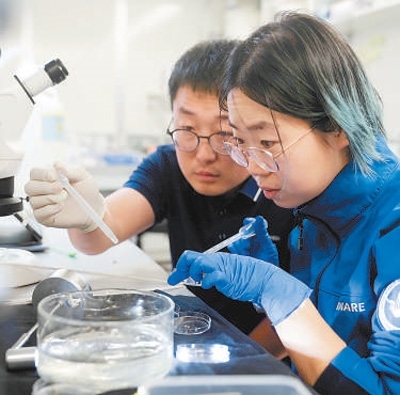“雪龍2”號科考船上,考察隊員遲旭朋(左)和武佳星在船載實驗室對南極浮游生物進行分樣。