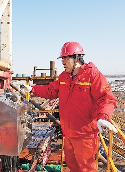 趙增權(quán)在油井操作平臺檢修儀器設(shè)備。