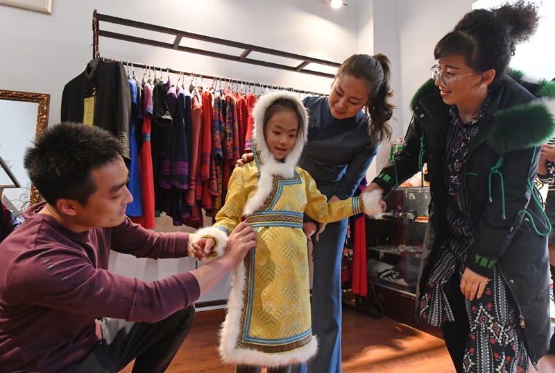1月8日,首府市民在選購蒙古族服飾。臨近春節(jié),蒙古族服飾受到市民的青睞,位于呼和浩特市玉泉區(qū)的昕儀民族服飾工作室里,工作人員忙碌著為顧客選款式、量尺寸,將民族特色和創(chuàng)意時(shí)尚融合在蒙古族服飾制作中,滿足顧客的不同需求。內(nèi)蒙古日報(bào)社融媒體記者 王磊 攝