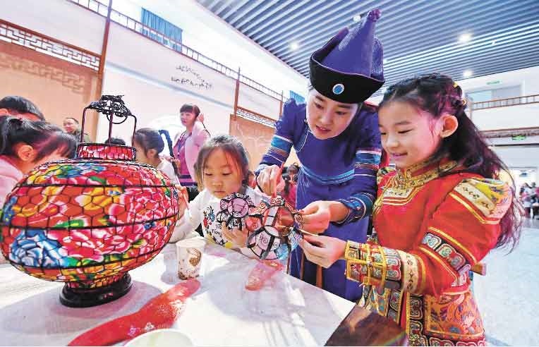 1月15日,小朋友們?cè)诜沁z年貨展互動(dòng)體驗(yàn)區(qū)學(xué)習(xí)制作燈籠。當(dāng)日,“非遺過大年文化進(jìn)萬家——2019年全區(qū)非物質(zhì)文化遺產(chǎn)年貨展”在內(nèi)蒙古展覽館舉辦,活動(dòng)日期為1月15日至24日。本次展覽精選了與傳統(tǒng)年俗有關(guān)的近100個(gè)非遺項(xiàng)目進(jìn)行集中展示,旨在推動(dòng)非物質(zhì)文化遺產(chǎn)創(chuàng)造性轉(zhuǎn)化、創(chuàng)新性發(fā)展,促進(jìn)文化脫貧攻堅(jiān),傳承和弘揚(yáng)民族優(yōu)秀傳統(tǒng)文化,將非遺融入傳統(tǒng)新春佳節(jié),讓記憶里的濃濃年味在非遺傳統(tǒng)中鮮活起來。(內(nèi)蒙古日?qǐng)?bào)社融媒體記者 王磊攝)