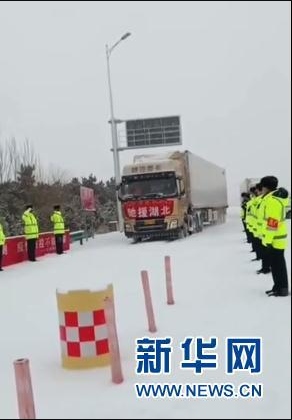 2月14日,內(nèi)蒙古多地普降大雪,從赤峰出發(fā)的運(yùn)輸車(chē)輛,在當(dāng)?shù)亟痪淖o(hù)送下順利踏上征途。沿途的交警列隊(duì)敬禮,目送車(chē)隊(duì)離去。