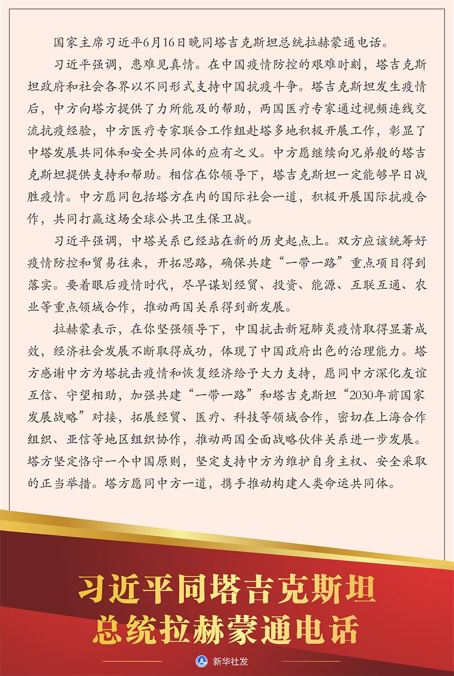 習近平強調(diào),患難見真情。在中國疫情防控的艱難時刻,塔吉克斯坦政府和社會各界以不同形式支持中國抗疫斗爭。塔吉克斯坦發(fā)生疫情后,中方向塔方提供了力所能及的幫助,兩國醫(yī)療專家通過視頻連線交流抗疫經(jīng)驗,中方醫(yī)療專家聯(lián)合工作組赴塔多地積極開展工作,彰顯了中塔發(fā)展共同體和安全共同體的應(yīng)有之義。中方愿繼續(xù)向兄弟般的塔吉克斯坦提供支持和幫助。相信在你領(lǐng)導(dǎo)下,塔吉克斯坦一定能夠早日戰(zhàn)勝疫情。中方愿同包括塔方在內(nèi)的國際社會一道,積極開展國際抗疫合作,共同打贏這場全球公共衛(wèi)生保衛(wèi)戰(zhàn)。
