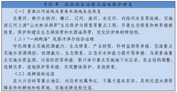 大力推進(jìn)黃河生態(tài)帶建設(shè),統(tǒng)籌水環(huán)境、水生態(tài)、水資源、水安全、水文化,推進(jìn)干支流一體化治理,突出抓好十大孔兌、多沙粗砂區(qū)集中來源區(qū)等水土保持治理,實(shí)施河道和灘區(qū)綜合提升治理工程,完善水沙調(diào)控機(jī)制。深化“一湖兩?!奔安旌鼓谞柹鷳B(tài)環(huán)境綜合治理,創(chuàng)新區(qū)域系統(tǒng)治理和流域整體治理舉措,逐步改善生態(tài)環(huán)境。全面加強(qiáng)嫩江、遼河、內(nèi)陸河水系等流域和達(dá)里諾爾、烏拉蓋等濕地生態(tài)保護(hù)修復(fù),深入開展地下水超采綜合治理。