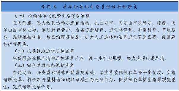 把保護(hù)草原、森林作為首要任務(wù),嚴(yán)格執(zhí)行基本草原保護(hù)制度,落實(shí)草原生態(tài)保護(hù)補(bǔ)助獎(jiǎng)勵(lì)政策,完善草畜平衡和草原禁牧休牧制度。嚴(yán)禁在草原上亂采濫挖、新上礦產(chǎn)資源開發(fā)等工業(yè)項(xiàng)目,已批準(zhǔn)在建運(yùn)營的礦山、風(fēng)電、光伏等項(xiàng)目到期退出,新建風(fēng)電、光伏電站重點(diǎn)布局在沙漠荒漠、采煤沉陷區(qū)、露天礦排土場,推廣“光伏+生態(tài)治理”基地建設(shè)模式。開展草原生態(tài)承載能力核定和草原生態(tài)系統(tǒng)健康評(píng)價(jià),實(shí)施草原保護(hù)和修復(fù)重大工程??茖W(xué)開展大規(guī)模國土綠化行動(dòng),實(shí)施三北防護(hù)林體系建設(shè)、公益林保護(hù)、森林質(zhì)量精準(zhǔn)提升等工程,探索大興安嶺一體化保護(hù)模式,推進(jìn)已墾森林草原退耕還林還草,加強(qiáng)森林撫育和退化林修復(fù),提升生態(tài)系統(tǒng)質(zhì)量和穩(wěn)定性。加快構(gòu)建以國家公園為主體的自然保護(hù)地體系。