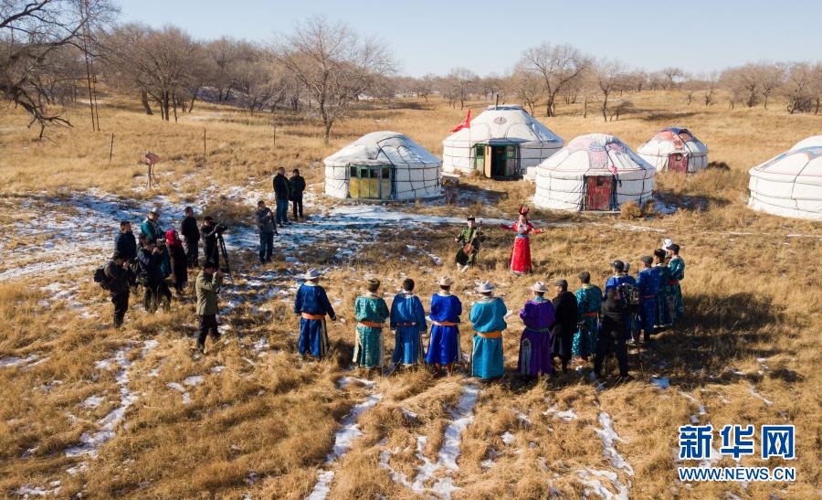 2018年11月9日,內(nèi)蒙古自治區(qū)錫林郭勒盟烏蘭牧騎隊(duì)員來(lái)到西烏珠穆沁旗烏蘭哈拉嘎蘇木新高勒嘎查的黨員中心戶恩克巴雅爾家,在戶外為周邊牧民表演節(jié)目(無(wú)人機(jī)照片)。新華社記者 彭源 攝