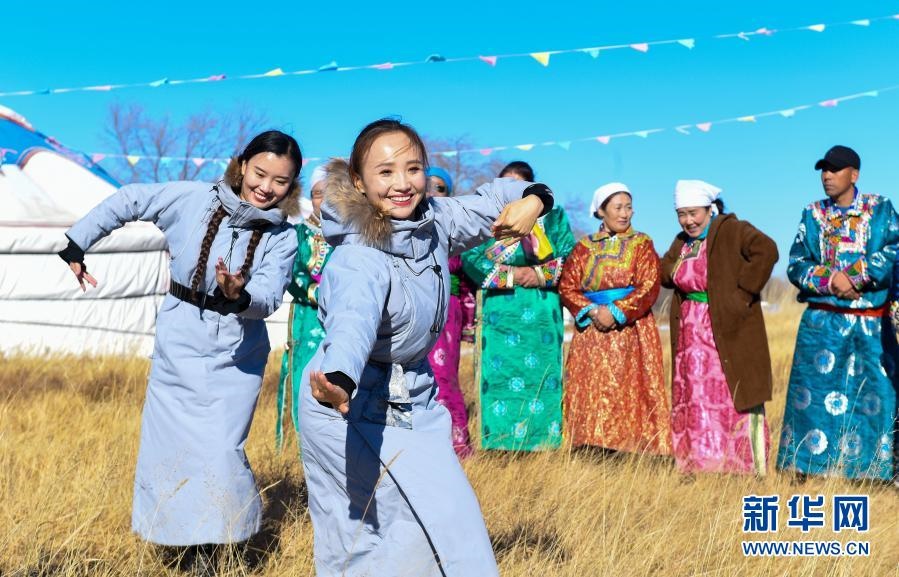 2018年11月9日,內(nèi)蒙古自治區(qū)錫林郭勒盟烏蘭牧騎隊(duì)員來(lái)到西烏珠穆沁旗烏蘭哈拉嘎蘇木新高勒嘎查的黨員中心戶恩克巴雅爾家,為周邊牧民表演舞蹈。新華社記者 彭源 攝