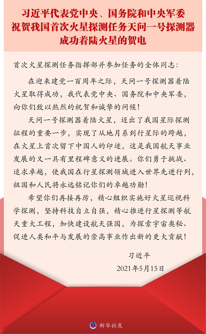 在迎來建黨一百周年之際,天問一號探測器著陸火星取得成功,我代表黨中央、國務院和中央軍委,向你們致以熱烈的祝賀和誠摯的問候!